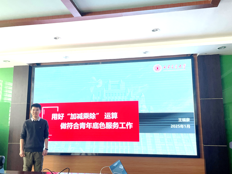 王福豪汇报了2024年度的团建工作和班级管理取得的成果,总结分享了团组织建设、思想引领、青年服务等方面的工作,并汇报了未来一年学院团建重点工作规划。