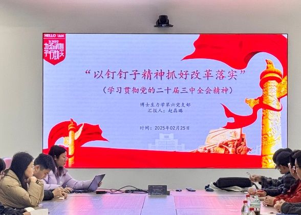会议第一项由博士生力学第六党支部书记赵晶璐开展专题领学。本次领学主题为“以钉钉子精神抓好改革落实”,聚焦学习贯彻党的二十届三中全会精神,通过结合支部建设实际,强调改革落实需立足“韧劲”“实劲”和“巧劲”。