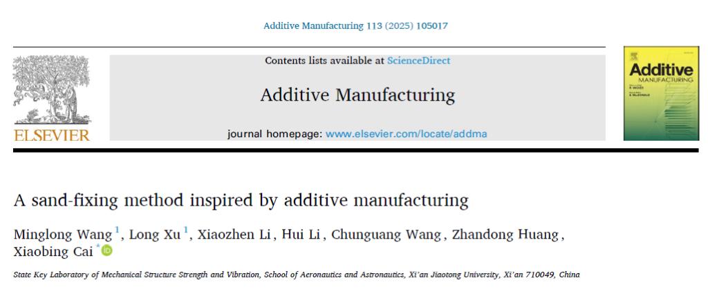 蔡小兵教授团队提出的无人机激光固沙技术,通过北斗导航精准定位,让无人机携带激光设备在沙漠表面烧蚀形成毫米级网格(MCBs),无需人工、仅耗电力即可实现全自动化固沙,相关成果发表于国际机械类顶级期刊《增材制造》(《Additive Manufacturing》),获得国际同行高度认可。